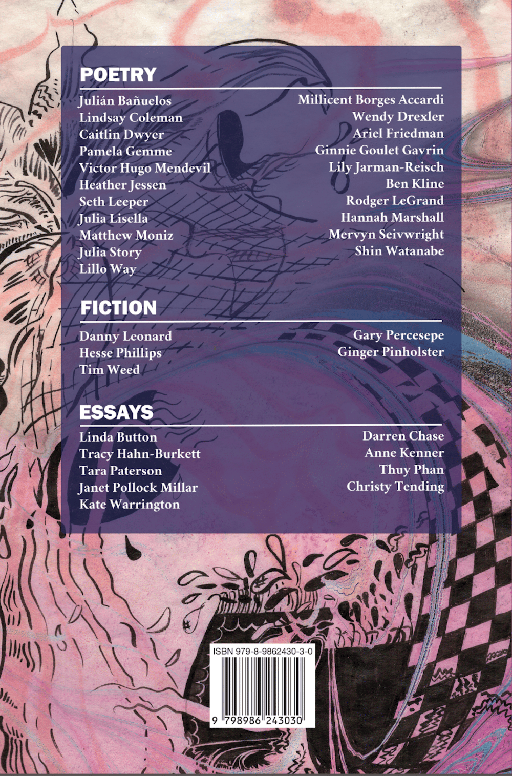 Poetry by Heather Jessen, Pamela Gemme, Julia Story, Ben Kline, Julia Lisella, Victor Hugo Mendevil, Hannah Marshall, Millicent Borges Accardi, Seth Leeper, Wendy Drexler, Shin Watanabe, Ariel Friedman, Caitlin Dwyer, Lillo Way, Lily Jarman-Reisch, Matthew Moniz, Lindsay Coleman, Ginnie Goulet Gavrin, Mervyn Seivwrigh, Julián Bañuelos, and Rodger LeGrand.